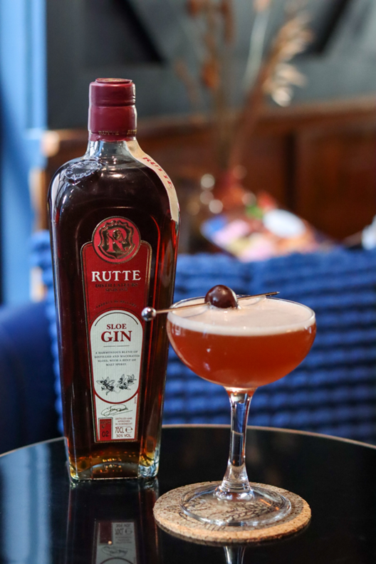 Rutte Sloe Gin bottle next to a crafted cocktail at Dutch Courage Cocktail Bar.