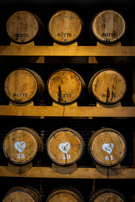 Aging barrels at Royal De Kuyper warehouse, marked with Rutte identifiers.